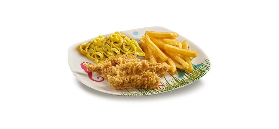 Çocuklarımıza özel tavuk parçaları,patates ve makarna ile servis edilir.