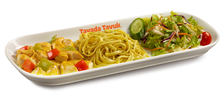 Köri sos, mantar ve kaliforniya biberiyle marine edilmiş tavuk bonfile, pesto soslu makarna ve salata ile servis edilir. (Ekonomik Tabaklarımız 150 gr'dır.)