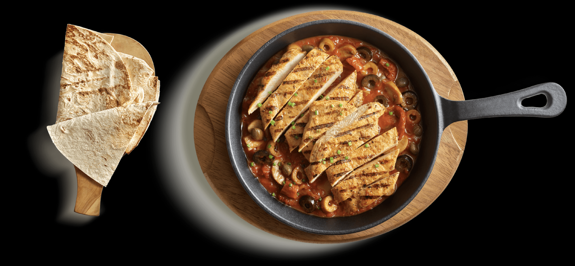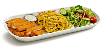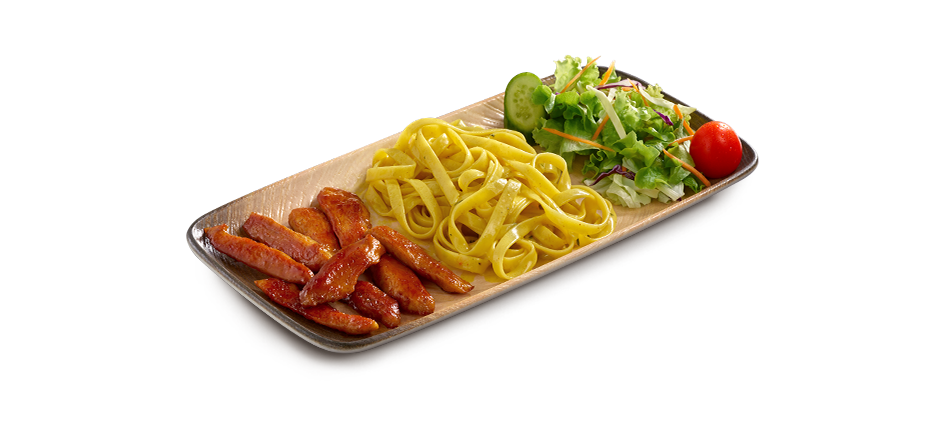 Tatlı ve hafif acı Sweet Chili sosuyla harmanlanmış, dışı çıtır içi yumuşacık tavuk bonfile, pesto soslu makarna ve salata ile servis edilir.