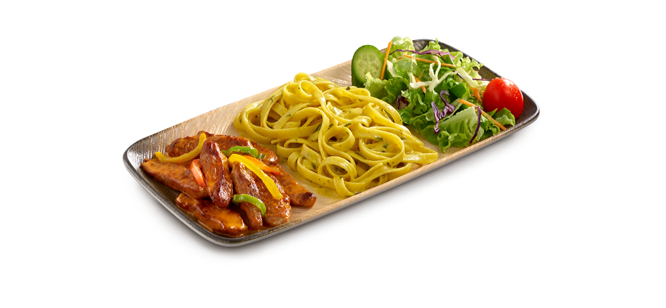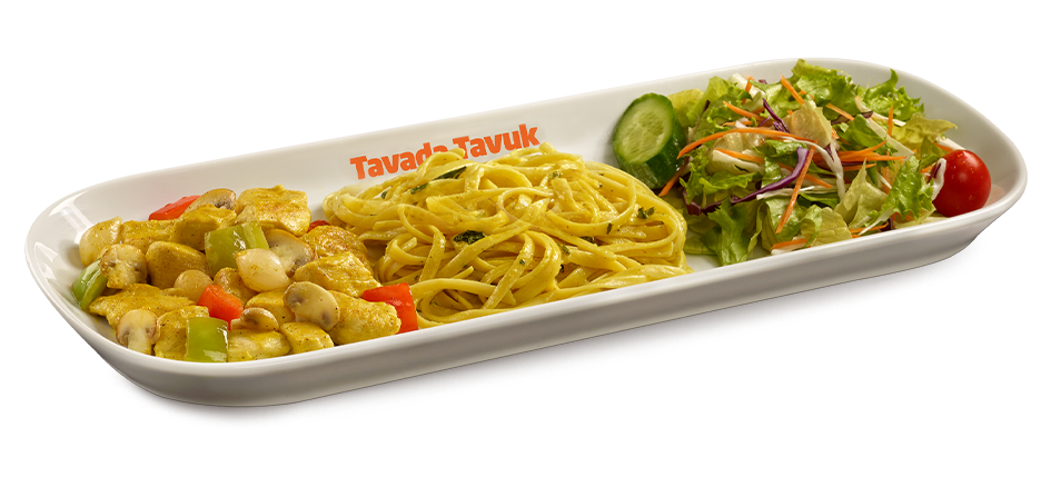 Acılı köri sos, mantar ve kaliforniya biberiyle marine edilmiş tavuk bonfile, özel pesto soslu makarna ve salata ile servis edilir.