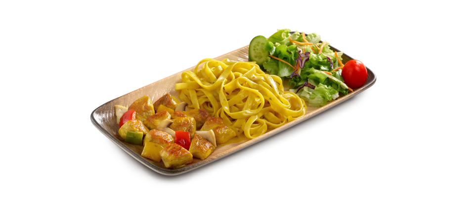 Köri sos, mantar ve kaliforniya biberiyle marine edilmiş tavuk bonfile, pesto soslu makarna ve salata ile servis edilir. (Ekonomik Tabaklarımız 150 gr'dır.)