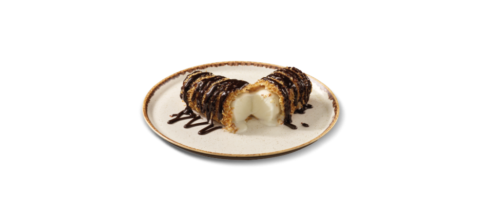 Dışarıdan çıtır, içerden ise yumuşak ve kremsi bir lezzet sunan kızarmış dondurma, sıcak servis ediliyor ve zengin çikolata sosu ile tamamlanıyor.